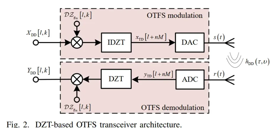 图2展示了DZT-based OTFS的系统框图,其核心特点是直接在DD域和时域之间进行变换,绕过了时频域: