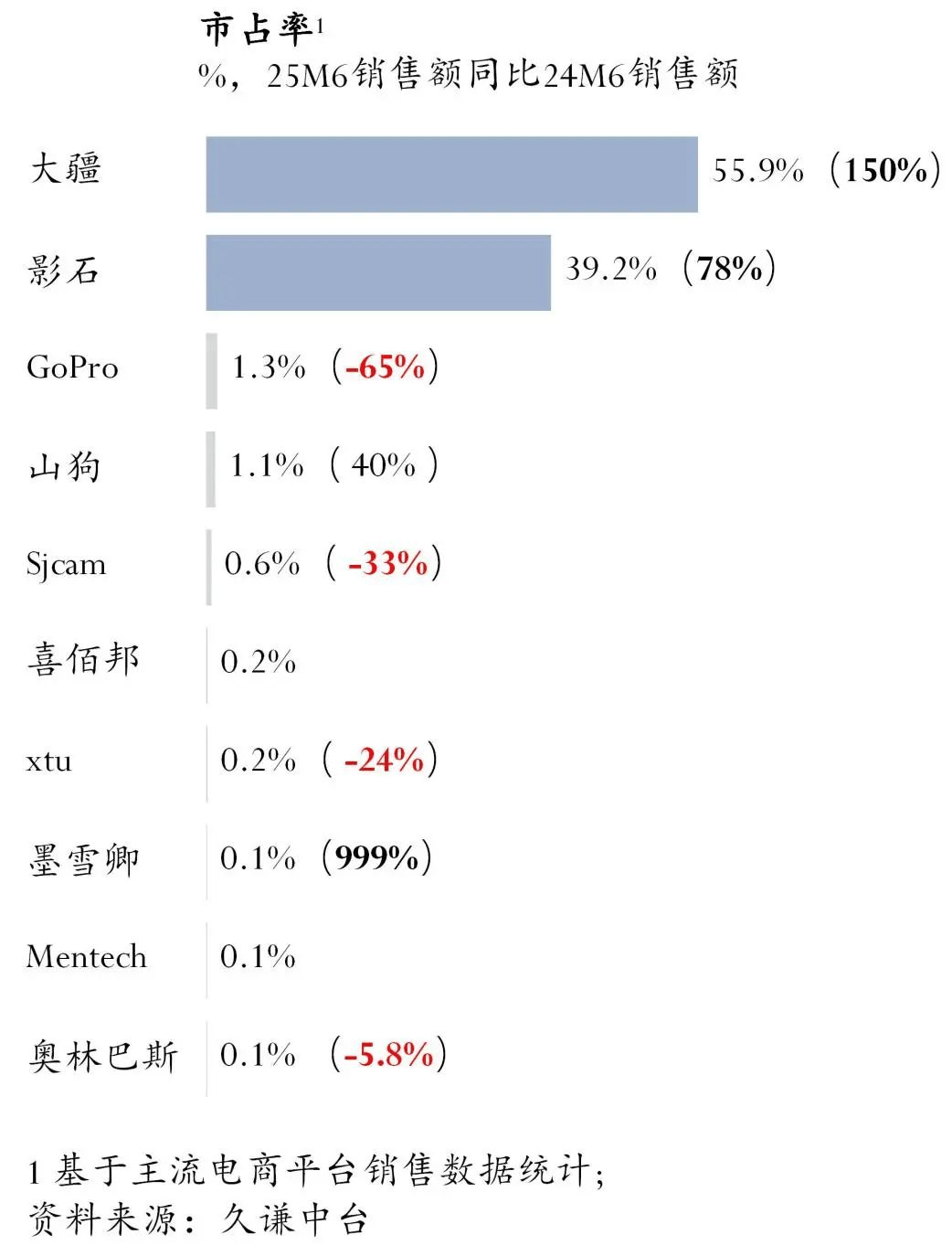 总的来说,运动相机市场仍然呈现出高度集中的竞争格局,多数品牌面临较大的增长压力,尤其是市场份额较小或已趋于饱和的品牌。