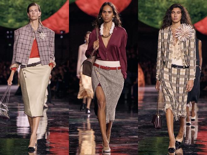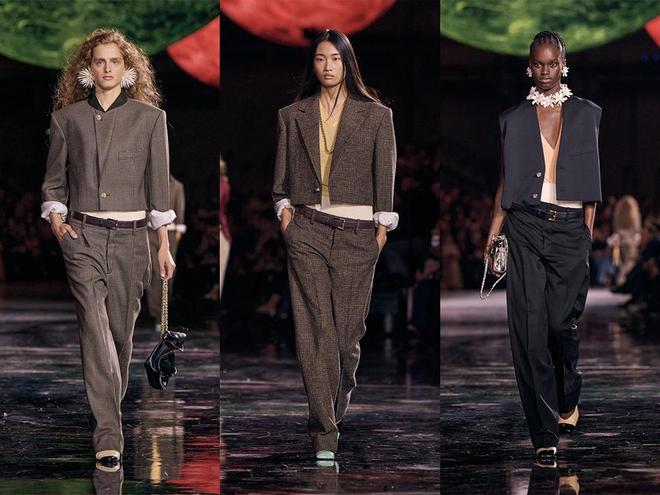 而最精彩的还是粗花呢套装,Matthieu Blazy 对这一品牌符号进行了全方位的解构重塑。面料上,除了常规的粗花呢,他也尝试了更轻盈的粘胶纤维,或是以钩针编织模拟粗花呢的纹路;剪裁上,带来了极具建筑感的夹克,也有腰线下移、高开衩的半身裙;搭配上,摆脱粗花呢套装一体化的思路,引入对比与变化,带来更多灵动感。