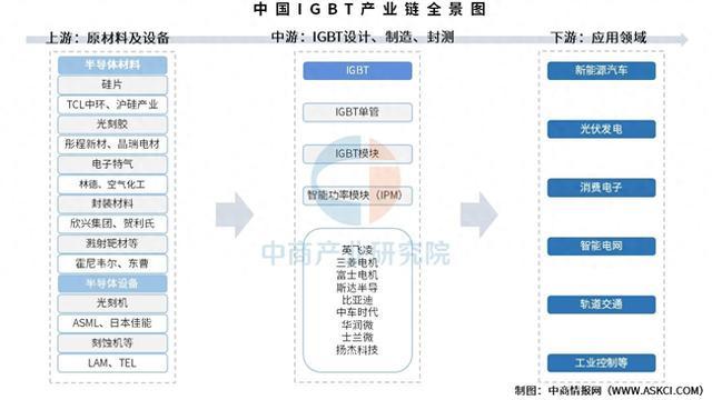 IGBT产业链上游为原材料及设备,其中原材料为半导体材料,包括硅片、光刻胶、电子特气、封装材料、溅射靶材等,设备为半导体设备,包括光刻机、刻蚀机等;中游为IGBT芯片的设计、制造、封测过程,IGBT按照产品的封装形式分类可分为IGBT单管、IGBT模块和智能功率模块(IPM);下游广泛应用于新能源汽车、光伏发电、消费电子、智能电网、轨道交通、工业控制等领域。