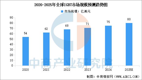 IGBT是目前发展最快的功率半导体器件之一。中商产业研究院发布的《2025-2030年全球及中国IGBT市场调查与行业前景预测专题研究报告》显示,2024年全球IGBT的市场规模约为75亿美元,较上年增长5.6%。受益于新能源汽车、风光储、工业控制等领域需求的爆发式增长,中商产业研究院分析师预测,2025年全球IGBT市场规模将达到80亿美元。