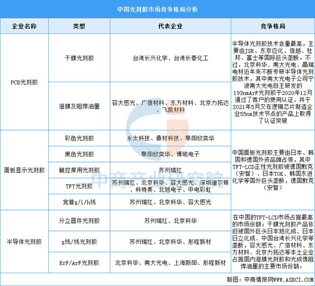 光刻胶的应用领域主要为半导体产业、面板产业和PCB产业。从细分市场来看,在半导体光刻胶市场,由于技术含量最高,市场主要由JSR、东京应化、信越、杜邦、富士等国际巨头垄断。具体如图所示: