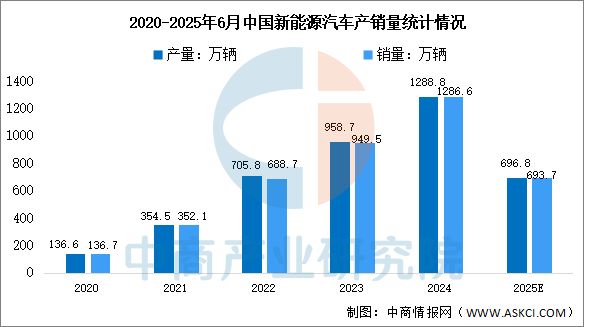 据中国汽车工业协会数据,2025年6月,新能源汽车产销分别完成126.8万辆和132.9万辆,同比分别增长26.4%和26.7%。2025年1-6月,新能源汽车产销分别完成696.8万辆和693.7万辆,同比分别增长41.4%和40.3%。