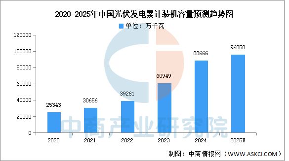 从国内来看,我国以光伏发电为代表的新能源发展成效显著,装机规模稳居全球首位,发电量占比稳步提升,成本快速下降,已基本进入平价无补贴发展的新阶段,行业未来发展空间广阔。中商产业研究院发布的《2025-2030年中国光伏电池行业市场前景预测及未来发展趋势研究报告》显示,2024年中国光伏发电累计装机容量88666万千瓦,同比增长45.2%。中商产业研究院分析师预测,2025年中国光伏发电累计装机容量有望达96050万千瓦。