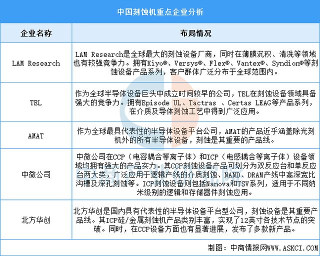 刻蚀机行业的竞争格局呈现出高度集中且竞争激烈的态势。全球范围内,以LAMResearch、AMAT和TEL为代表的国际巨头占据了市场的主导地位,它们凭借先进的技术、丰富的产品线和广泛的客户群体,在全球刻蚀机市场中占据了大部分份额。中微公司和北方华创等本土企业凭借自主研发和创新能力,逐渐在刻蚀机领域崭露头角,成为国内刻蚀机行业的领军企业。具体如图所示:
