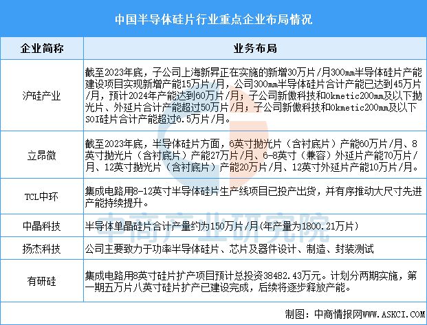 与国际主要半导体硅片供应商相比,中国大陆半导体硅片厂商市场份额较小,技术工艺水平以及良品率控制等与国际先进水平相比仍具有显著差距。国内半导体硅片龙头企业沪硅产业、立昂微、TCL中环、中晶科技等,相关产能及业务布局情况如下图所示: