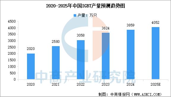 IGBT被称为电力电子行业里的“CPU”,广泛应用于电机节能、轨道交通、新能源汽车等领域。目前在轨道交通领域已经实现技术突破,在新能源汽车领域,IGBT是电控系统和直流充电桩的核心器件,我国IGBT产量快速增长。中商产业研究院发布的《2025-2030年全球及中国IGBT市场调查与行业前景预测专题研究报告》显示,2024年中国IGBT产量达到3859万只。中商产业研究院分析师预测,2025年中国IGBT产量将超过4000万只。