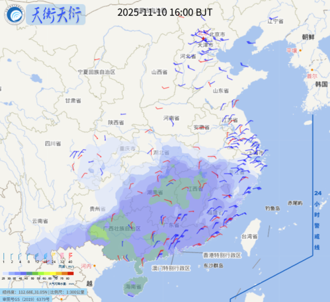 10日16时,综合气象观测产品系统(天衡天衍)大气可降水量叠加850hPa组合风场产品(图3)显示,广西、广东、海南、江西等局地大气可降水量较高,局地超过45mm。